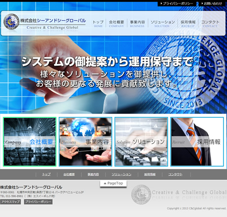 トップページはバナーのオンマウスで背景が切り替わるスライドを実装し、メールフォームはお問い合わせ用と求人応募用をそれぞれ設置。